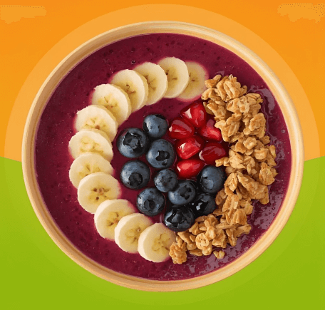 Organic Acai, banana, blueberries, strawberries, coconut milk, honey (Optional), Toppings (Granola, berries, coconut flakes, chia seeds, peanut butter)